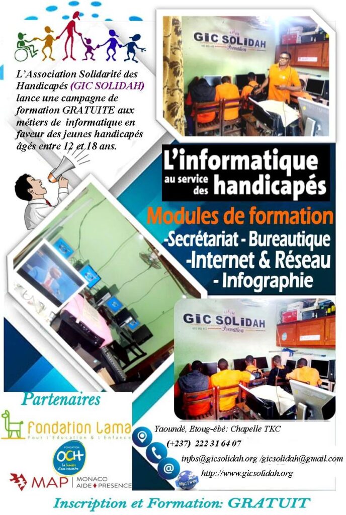 l’Association Solidarité des Handicapées (GIC SOLIDAH), lance une campagne de formation GRATUITE aux métiers de l’informatique en faveur des jeunes handicapées. Les inscriptions ont débutés et se déroulent dans les locaux du GIC SOLIDAH (situé à étoug-ébé), Tél: (00237 222 316 407) ou par E-mail: gicsolidah@gmail.com. / infos@gicsolidah.org